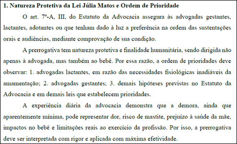 - Início da Fase de Sustentações Orais diretamente pelas prioridades estabelecidas no Estatuto da Advocacia, e especialmente pelas advogadas lactantes, seguidas das gestantes, evitando a utilização de listas internas ou prioridades sem base legal.