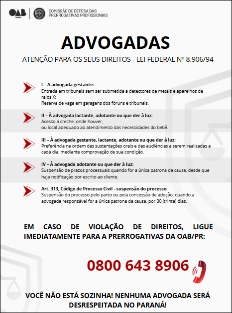 O documento esclareceu que a campanha surgiu a partir de reclamações de advogadas que tiveram seus pedidos de observância desses direitos negados, muitas vezes sob alegações institucionais que, segundo a OAB/PR, não podem se sobrepor a uma lei federal.